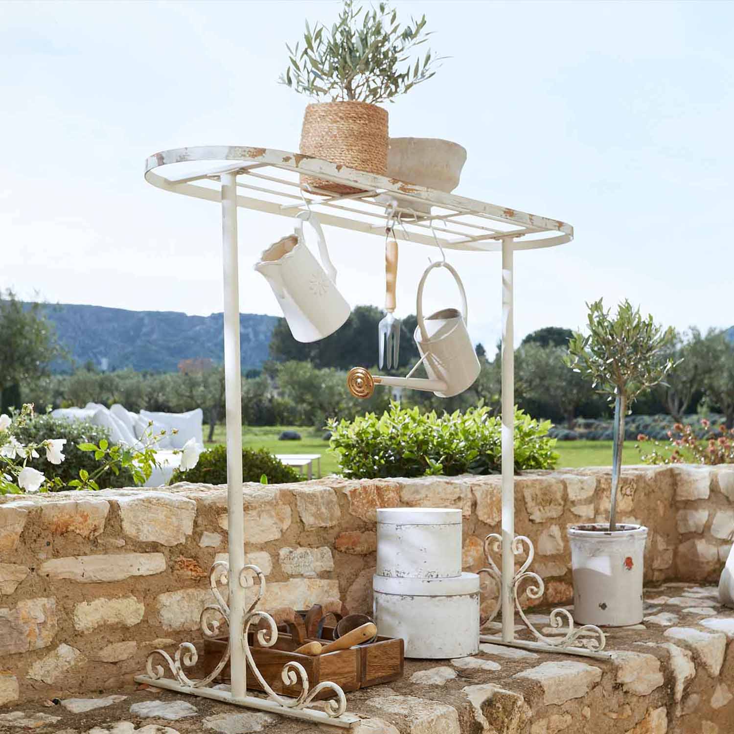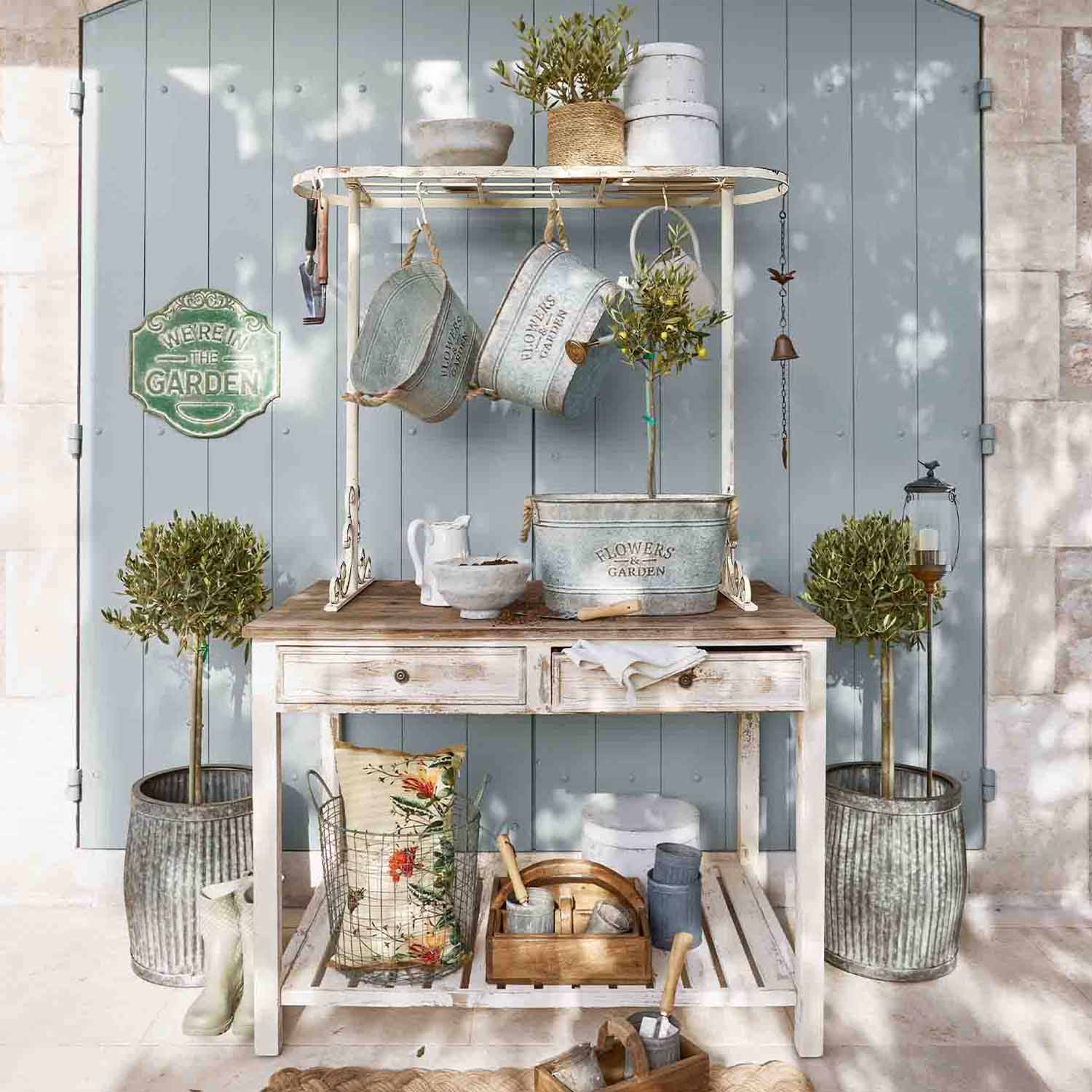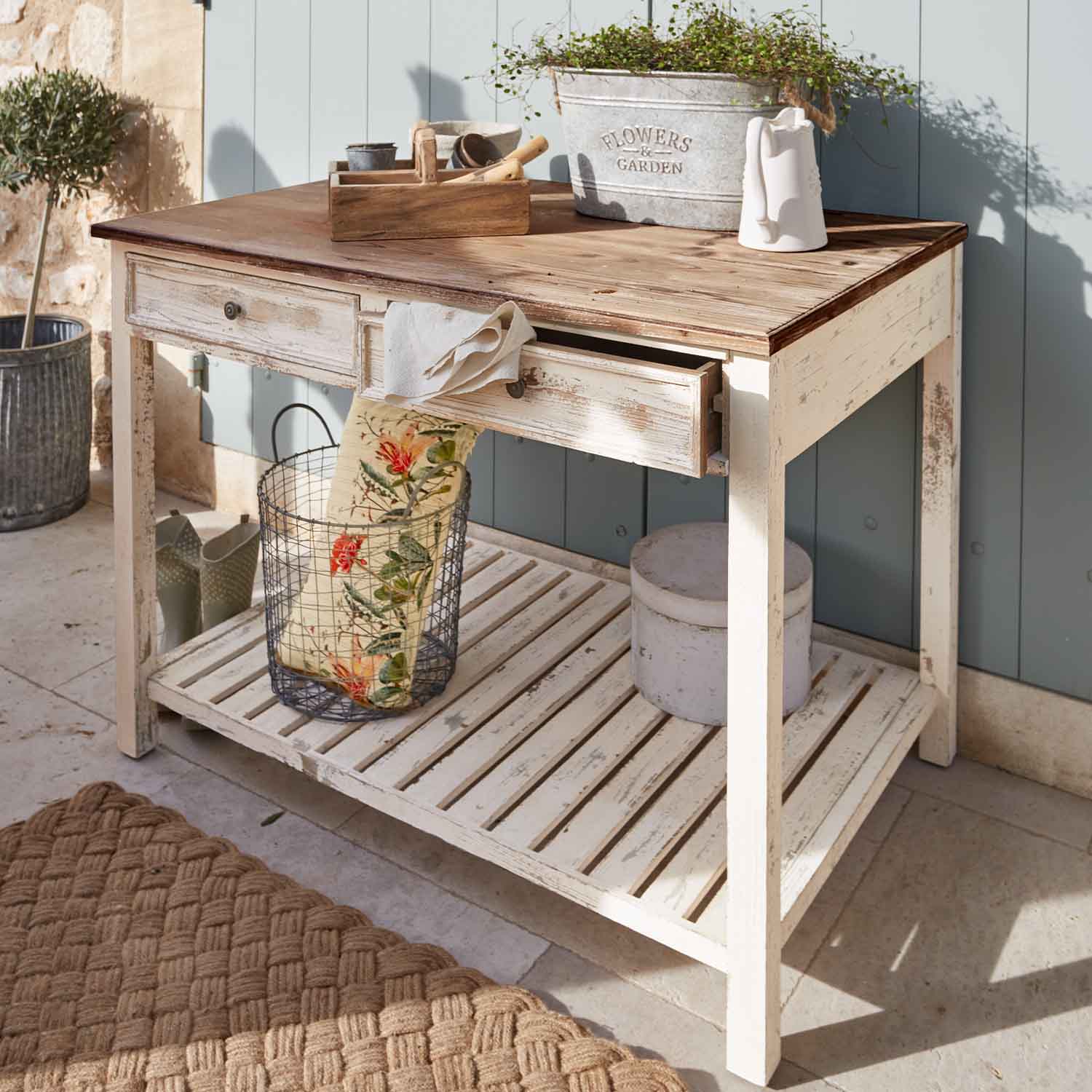 Stilvoller Arbeitsplatz mit Ablageflächen für Erde, Töpfe und die liebsten Gartenhelfer.